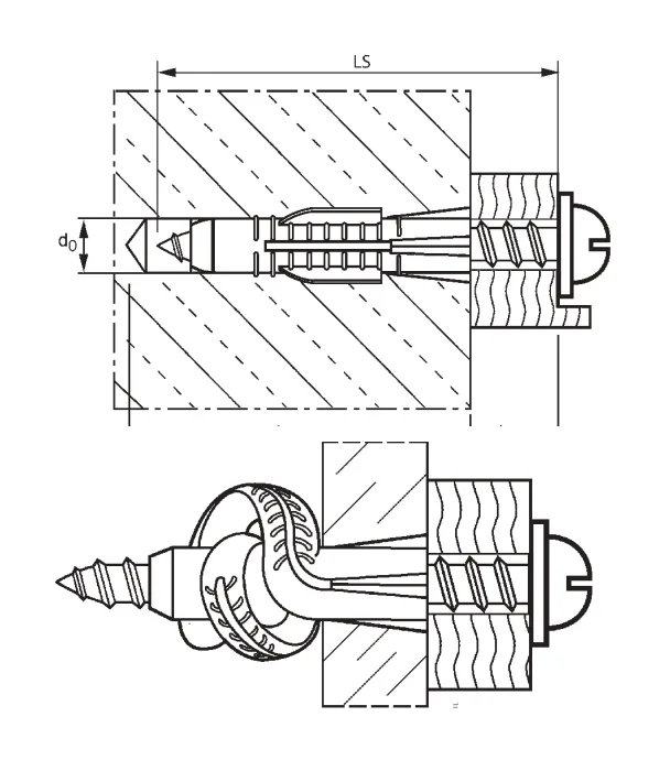 Универсальный дюбель MKT UD автоматически адаптируется к типу основания: раскрывает лепестки в пустотах и работает как распорный дюбель в плотных материалах.